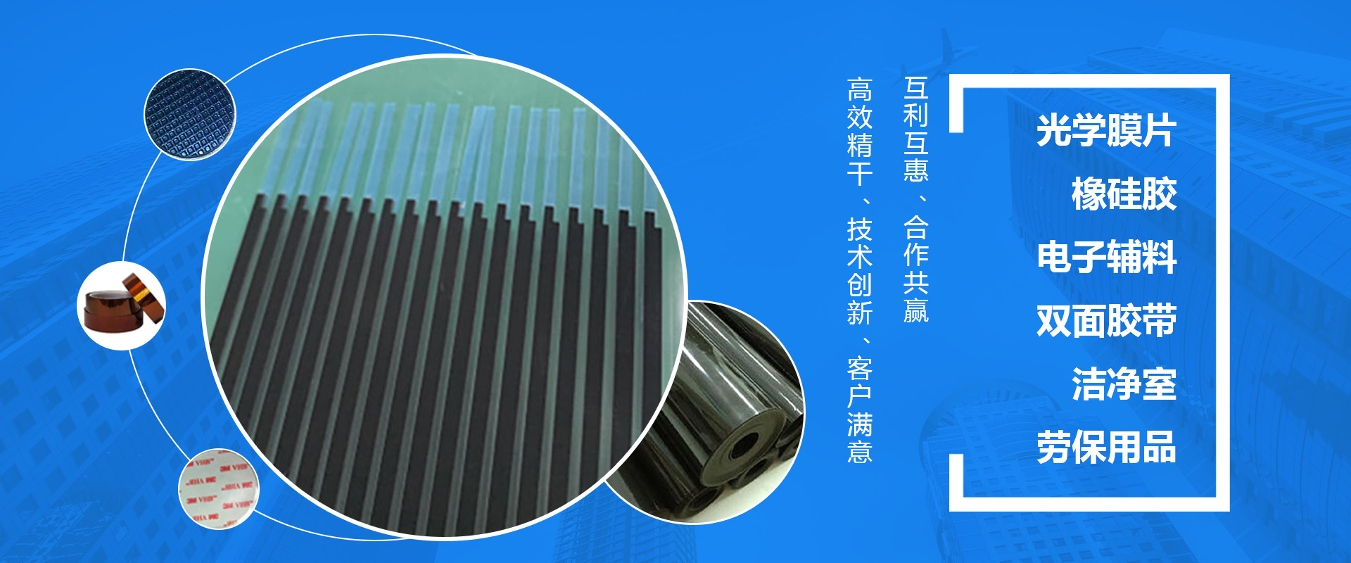 為廣大客戶提供封箱膠帶、潔凈室用手套、潔凈室擦拭紙等擦拭用產品、無塵服和無塵工具、包裝材料等勞保用品。