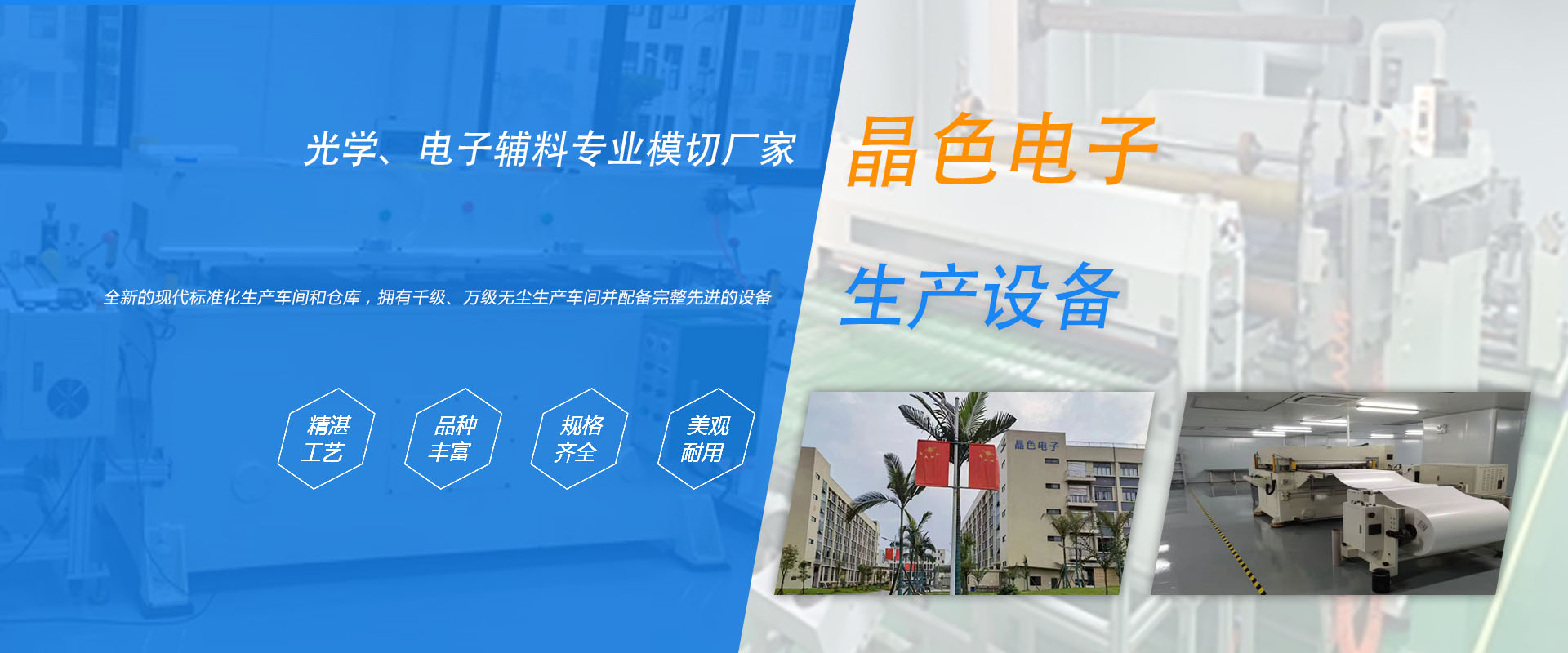 晶色電子處于風景優美的有長江首城之稱的宜賓市,位于環境優雅的臨港經開區眾信集團內。擁有全新的現代標準化生產車間和倉庫,擁有千級、萬級無塵生產車間并配備完整先進的設備,擁有行業內經驗豐富的管理團隊及行業內高技能高工齡技術人才。本公司致力于顯示器、電視機、手機等電子行業的輔料模切,專注于各型號光學膜片、膠帶材料、導電材料、絕緣材料等的模切生產,是光電顯示類薄膜器件方案的解決提供商。為廣大客戶提供封箱膠帶、潔凈室用手套、潔凈室擦拭紙等擦拭用產品、無塵服和無塵工具、包裝材料等勞保用品。